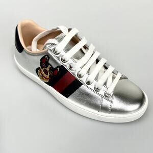 Gucci Womens Silver Leather Ace Embroidered Web Low Top Sneakers Size 34