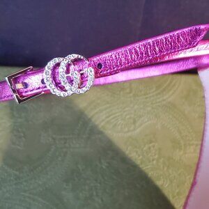 Crafted in metallic fuchsia leather, the high-heel sandal sports a subtle design with a thin heel and three front straps. A delicate crystal Double G buckle embellishes the ankle strap. Metallic fuchsia leather. Ankle strap with metal Double G buckles with crystals. High heel 4.5" heel height. Made in Italy