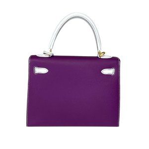 This beautiful Brand New Special Order Hermès Kelly 25 Sellier Horse Shoe Stamp (HSS) Bag crafted from epsom leather in stunning purple "Anemone" and white "Blanc" colors. The bag features a white leather top handle and trim detail with purple contrast stitching, an optional crossbody strap, special brushed gold-plated hardware only offered on HSS bags, padlock and leather clochette with 2 keys, interior with one zip pocket and two slip pockets, and turnlock closure.