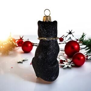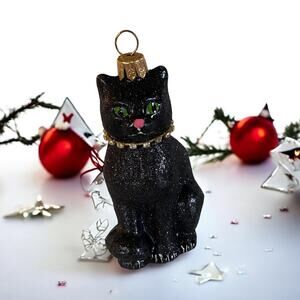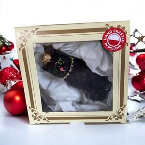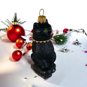 NIB Hand Painted Poland Holiday Glitter Black Cat Glass Christmas Tree Ornament