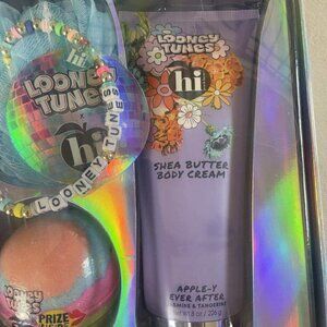 NIB Hi Peach Layne Looney Tunes Bath Set Limited Edition. Bubble Bath, Body Cream, Bath Bomb, Loofah and Bracelet