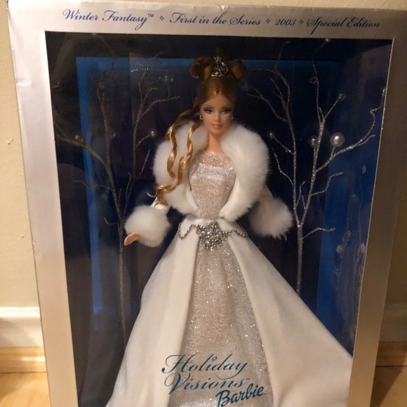 Experience the magic of the holiday season with the 2003 Holiday Visions Winter Fantasy Barbie. This fashion doll is part of the first series and comes in its original packaging, unopened.