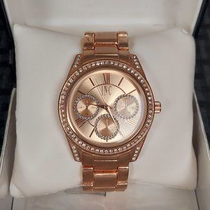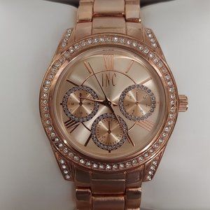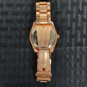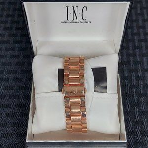 New in Box International Concepts Rose Gold-Tone Bracelet Watch. Shimmering crystals highlight the dial and case of this beautiful timepiece. Stainless steel bracelet with push buckle closure, round case, 40mm, crystal-set bezel, quartz movement, multifunction dial with roman numerals, stick indices, three hands, three decorative subdials, and INC logo. Water resistant to 30 meters. Fits up to approx. 6.75 inch wrist. Additional link included (approx. 3/8 inch). Comes with original box (as pictured). **Note - some fading to case back and links near buckle (see pics)** / ***Add'l Note - fully functional, but requires a new battery which is included with purchase*** / ***Remember to Bundle & Save***