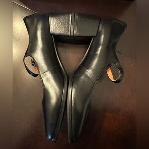 Features: Slip-on style, leather uppers, square toe, adjustable buckle vamp strap, memory foam footbed, chunky block heel (2”)