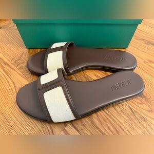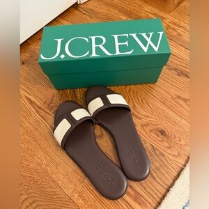 NIB J.Crew Georgina Sandals in Canvas and Leather Strap Slide Sandals size 8 in Rich Hickory Ivory