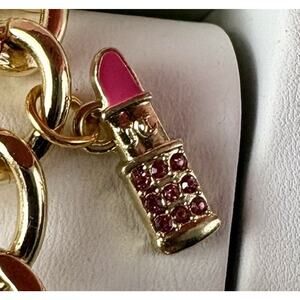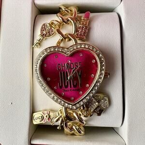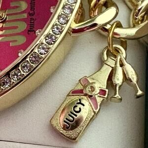 NIB JUICY COUTURE Gold Pink Rhinestone Heart Watch Charm Bracelet Crest Key GIFT