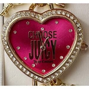 Gold tone JUICY COUTURE Hot Pink Rhinestone Encrusted Heart-Shaped “CHOOSE JUICY” Watch Charm Bracelet with Four (4) Dangling Gold tone Rhinestone Engraved Charms & Lobster Safety Clasp