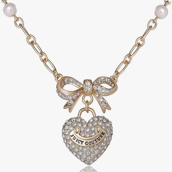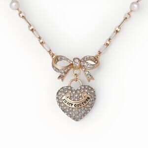 NIB JUICY COUTURE Gold Rhinestone Heart Bow Pearl Pendant Necklace 18”+2” GIFT