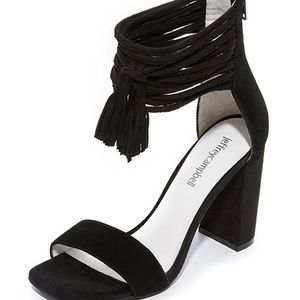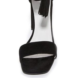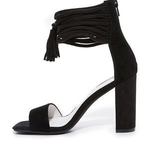 Super soft corded suede ankle straps with tassel detailing elevates this classic suede heel.