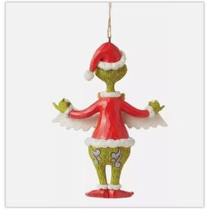 This Jim Shore ornament features The Grinch with a Merry Christmas banner and holiday wreath. With a bell and rosemale details, he wears a Santa suit and hat with a smile. Celebrate the season in style with this iconic Christmas character!