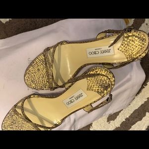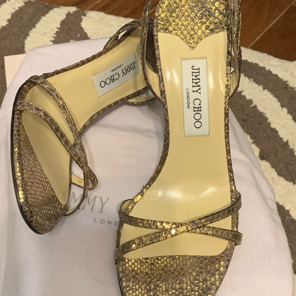 Jimmy Choo Gold Python snakeskin sandals; I tried them on once in the Jimmy Choo store/Las Vegas. Never worn, except trying them on in the store. Dust bag and original box are included.