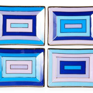 Featuring 60s inspired concentric squares in cool blues and shades of lavender, our petite trays are perfect bedside, at your sink, or topping off your tablescape. Crafted from high-fired porcelain with real gold accents. Packaged in a nifty gift box, they make a perfect hostess present (or pick-me-up for yourself). Set of four.