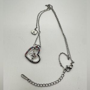 Beautiful "dancer" pendant with all sorts of colored purple, orange, blue rhinestones in the dress of the dancer and the heart ! The necklace is silver tone metal. There's a little heart "C" charm that dangles.