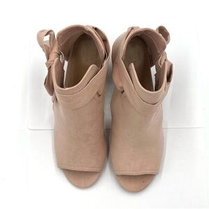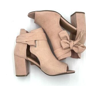 NIB Just Fab Karine Blush Suede Heeled Sandals Size 7. They have a bow that ties on the side. They have a 3.5” heel. Also in black in various sizes.