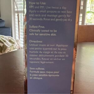Application: Apply a small amount to damp face and neck and massage gently for 30 seconds. Rinse and gently pat dry.