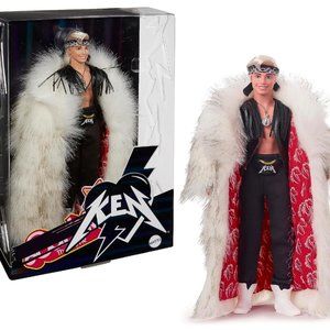 This collectible Ken® doll wows in a statement look inspired by Ken’s rebel rocker outfit in Barbie™ The Movie. He wears a dramatic faux fur coat over a black fringe vest and joggers. Styled just like film Ken, he makes a great gift for fans and collectors alike! Doll stand included. Doll cannot stand alone. Colors and decorations may vary.