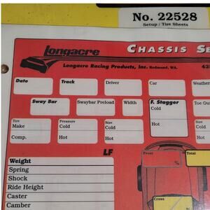NIB LONGACRE RACING 22528 Setup/Tire Sheets 2 X 50 Chassis Set-up