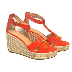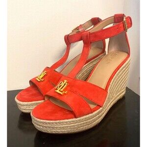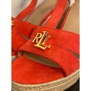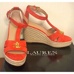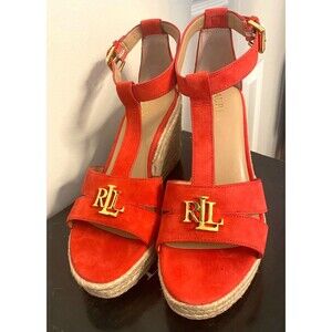 NIB LRL RALPH LAUREN Women's 7.5B HALE Red Suede Wedge Heels Sandals Gold Buckle