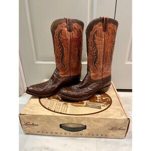 Brand New in the Original Box with knit dust covers and warranty card. Tag still attached to boot. Absolutely stunning Men's Sienna Pin Ostrich Medium Round Toe Mad Dog Goat, now selling for $1,495.00 on Lucchese website with limited sizing.