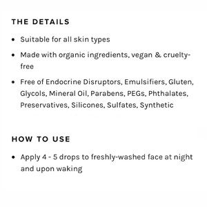 + TIPS: Apply 4-5 drops to freshly washed face at night & upon waking.
