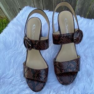 New in the box brown snakeskin sandals with an adjustable retro buckle at the ankle.