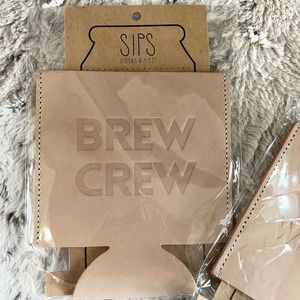These Leather Drink Can Coozies are a great idea for party favors, gifts, or just a fun treat for yourself. They are Brand New Still in Original Packaging. One says "BREW CREW" and the other says "HELLO WEEKEND". They are stamped into the leather.
