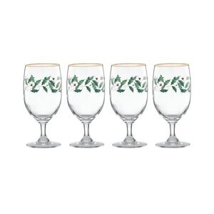 Enjoy some holiday libations with the 4-piece Iced Beverage Glass Set. A festive motif of holly leaves decorate the sides of these 24-karat gold accented glasses. This set is ideal for serving a cold beer or other chilled beverages.