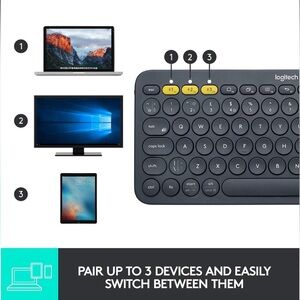 Compact Logitech K380 keyboard. Connects to multiple devices. Features dark gray finish with yellow switches buttons.