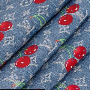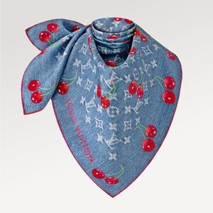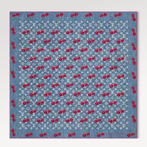 Created for the re-edition of the exceptional Louis Vuitton x Murakami collection, the all-silk LV x TM Denim Cerise square updates a historic House signature in the celebrated Japanese artist's bold, playful style. Its striking design combines a denim-look Monogram background with a vibrant pattern of bright, cheerful cherries. A Louis Vuitton signature in a matching shade adds an extra pop of color to this fun, versatile accessory.