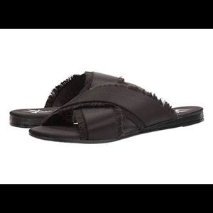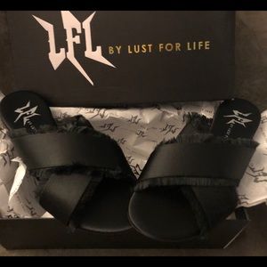 Brand New in Box Lust for Life L4L Black Slide on cross cross frill sandals. Satin finish with fringe detail. Size 7. Super trendy and cute! Retail $60
