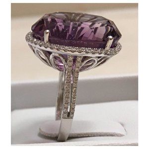 This ring is brand new, fashioned of 14 karat white gold, it features a GIGANTIC oval brilliant cut prong-set bright purple amethyst (19 x 16 mm face, 10 mm deep), approximately 22 carats, surrounded by 42 round brilliant cut white diamonds (1 mm diameter, G/H, SI1/SI2). The band is 2 mm wide and features a double row of diamonds half way around (24 on each side), for a total of 0.6 cts. There are two scratches on the amethyst that look like lint on the table; they cannot be felt, not even your fingernail would catch on them. One is about 2 mm long and the other is about 3 mm long. They are so slight, I could not get a photo. I only noticed them as I was using a loupe to check the clarity when preparing this for sale.