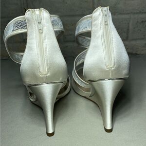 A peep-toe sandal done in sleek satin or floral embroidery is lofted by a sky-high architectural wedge. - 3 3/4" heel (approx)- Back zip closure - Textile upper/synthetic lining/leather sole - Imported