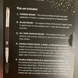 Because taking all your makeup brushed when you travel seems to take up way too much room! New in box and never used. This set includes: powder brush, blush brush, all over shadow brush, dual ended detail and all over brush and dual ended eyebrow spoolie and angled brow brush. Retails $25