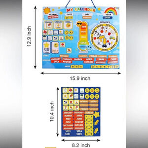 Our daily magnetic calendar includes a wheel with fun activties and a thermometer. It is equipped with the designs like seasons, numbers, monthes, activities and emotions. The board sign measures 15.9x12.9 inches.
