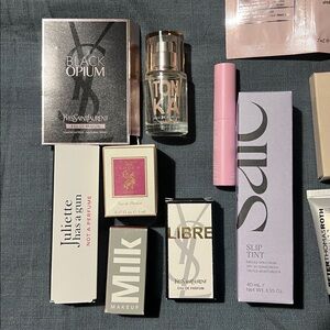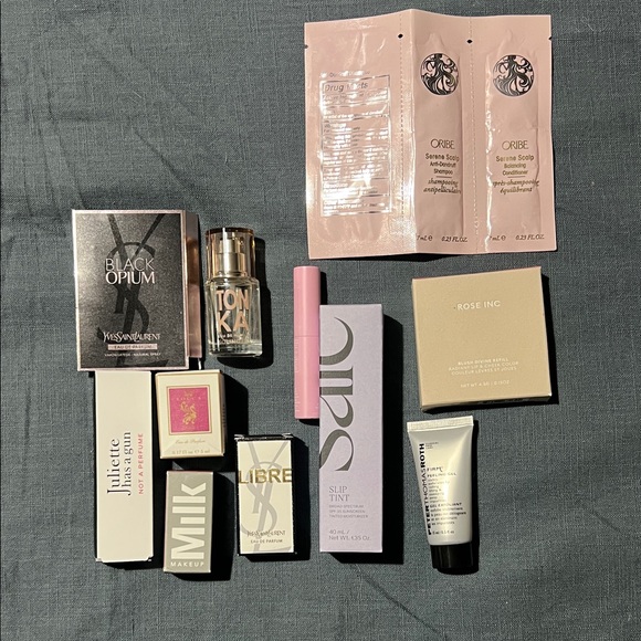 New unused makeup, hair, perfume bundle: Most of these items are from the Anthropologie advent box, others are extras I had from over buying 🫠 or samples. Included: YSL Libre Perfume .25 fl oz/, 7.5ml Juliet Has A Gun .17 fl oz/ 5ml Fragrance YSL Black Opium Sample .04 fl oz Tocca Perfume in Lucia .17 fl oz/ 5ml Tonka eau de perfume in Solinotes .5 fl oz/ 15 mil Rose Inc Blush Divine Refill 4.5 G full size in Heliotrope Slick Stick fly away stick .22 fl oz/ .67 ml Milk Makeup Lip & Cheek Stick in Werk (full size) Said Slip Tint Tinted Moisturizer in 3 Plus Half 40 ml (full size) Oribe Sarina Scalp Shampoo and Conditioner Sample Peter Thomas Roth Firm Peeling Gel 15 ml/ .5 fl oz