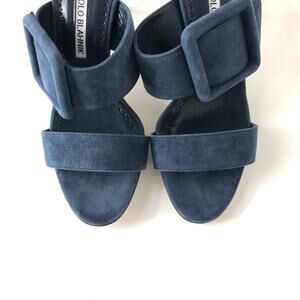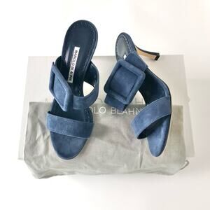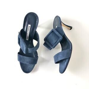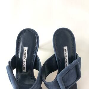 NIB Manolo Blahnik Gable Denim Navy Suede Buckle Detail Mules Slip On Sandals 36