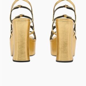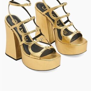 Chic gold platform sandals with strappy design. Elevate your look with bold style. Brand new, never worn. Still in box with dust bag.