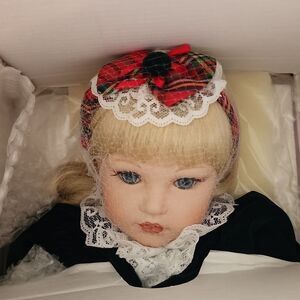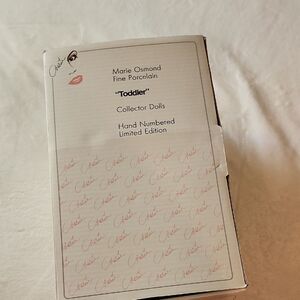 NIB Marie Osmonds Fine Porcelain Toddler Cassidy Doll Limited Edition, still attached to box not taken out ever, includes all accessories and certificate of authenticity, box has some water damage but it did not penetrative inside and only effects the box