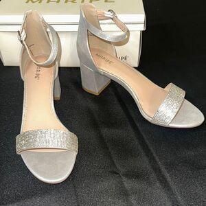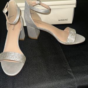 NIB Maripe Crystal Silver Heels with Ankle Strap and Block Heel Size 9