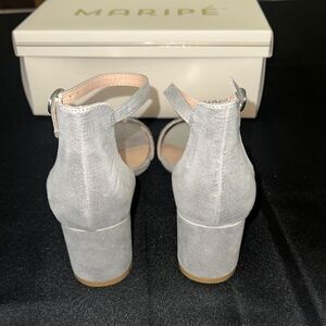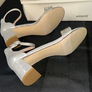 BRAND NEW! Elevate your style with Maripe's sophisticated silver and crystal heels, featuring a chic ankle strap and a comfortable block heel. These elegant shoes are perfect for formal occasions, offering a shimmering finish that adds a touch of glamour to any outfit. The open-toe design ensures a modern and versatile look, making them a timeless addition to your wardrobe.