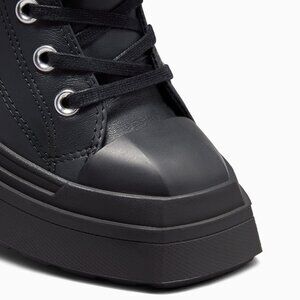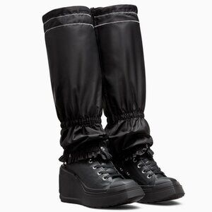 The Chuck 70 De Luxe Wedge, Converse's first collaboration with Brooklyn designer Martine Ali, transforms the fan-favorite icon into a modular statement piece. The edgy, leather platform design features removable gaiters that let you go from fashion-forward high top to bold knee-high style in an instant. The versatile construction is paired with contrast stitching, lace closures and hardware snap details that give it an elevated, subversive aesthetic.