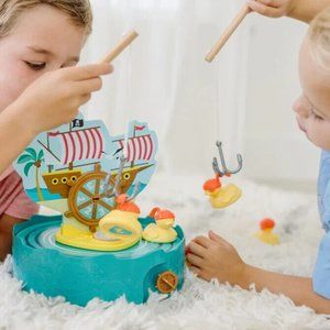 Experience the excitement of fairground fishing games by winding up the base to set 5 rubber ducks in motion, then trying to catch them with the wooden fishing rods Includes wind-up base (no batteries required!) with wooden pirate ship, 5 rubber ducks, 2 fishing rods, player card, game instructions Challenge a friend, work together to catch all the ducks, or play independently; encourages hand-eye coordination, counting and matching skills, and cooperative play