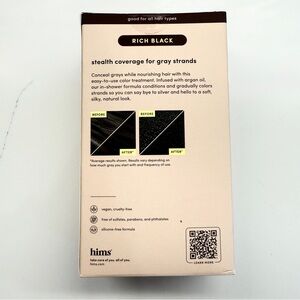 Keywords: Hims, hair color, conditioner, Rich Black, semi-permanent, argan oil, fresh forest scent, gray coverage, vegan, cruelty-free, unisex, all hair types, simple application, formal event, casual outing.