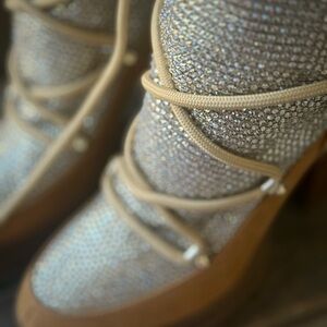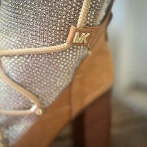 These boots are soooooo 🔥!!!! Michael Kors delivers another stunning boot! The lace-up Culver boots are the chicest way to brave the colder months. Lined in plush sherpa and set on a comfortable block heel, this eye-catching style is made from supple nubuck and crystal-embellished glitter chain mesh for a dazzling mix of textures. These boots are super unique and hard to find! Definitely a rarity, especially in a size 9! You will be warm but styling in those colder months!