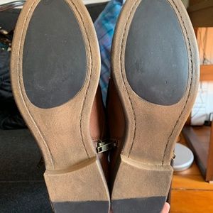 These brown booties (the color is 'Cognac') have never been worn and are new in box -- I love them, but the fit just wasn't right. Red accents around the gold zippers makes for a cool, steampunk look, and the low heel makes them wearable all day.