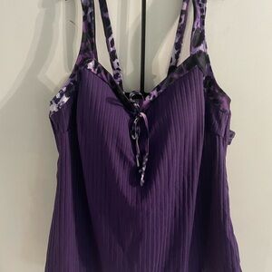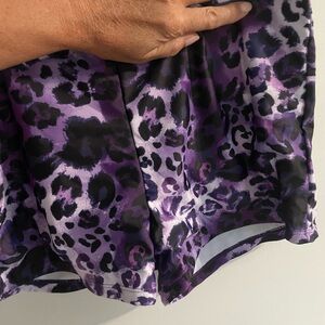 Vibrant purple fabric with leopard pattern. Boy short type bottoms. Stretchy- never worn.