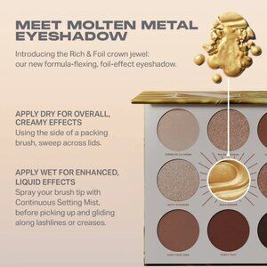 Discover a wealth of possibilities in a flash with Morphe's Rich & Foiled Eyeshadow Palettes. Inspired by the unstoppable allure of precious metals, these excessive and expressive nine-pan curations elevate eye artistry with luxe mattes, shimmers, and metallics—plus, a crown jewel: a debut foil-effect Molten Metal Eyeshadow. Apply it dry for overall, creamy, incredibly luminous payoff or wet for enhanced, molten-like shine.