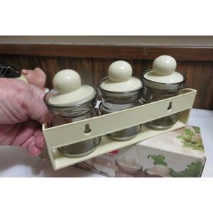 BRAND NEW STORAGE JARS THAT ARE SMALL FOR THINGS LIKE SPICES. AIR TIGHT AND HAVE THEIR OWN SHELF