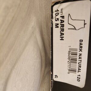 NIB NINE WEST DARK NATURAL FARRAH LEATHER HEELS BOOTS 10.5 M. NIB/Original box/packaging. No rips/stains/scuffs/tears/peeling. May have been tried on, I see a scant amount of dirt markings on the bottom of one shoe. No wear. Smoke free home. No odors. All offers are welcome. Thank you!