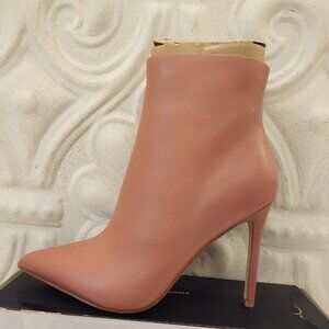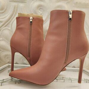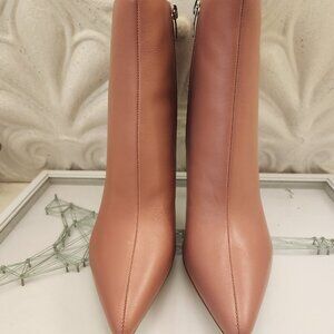 4-inch heel height. Point toe. Size zips/intact. Color: dark natural, almost a tan with a hint of salmon pink, gorgeous.